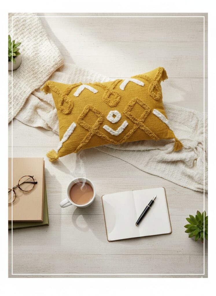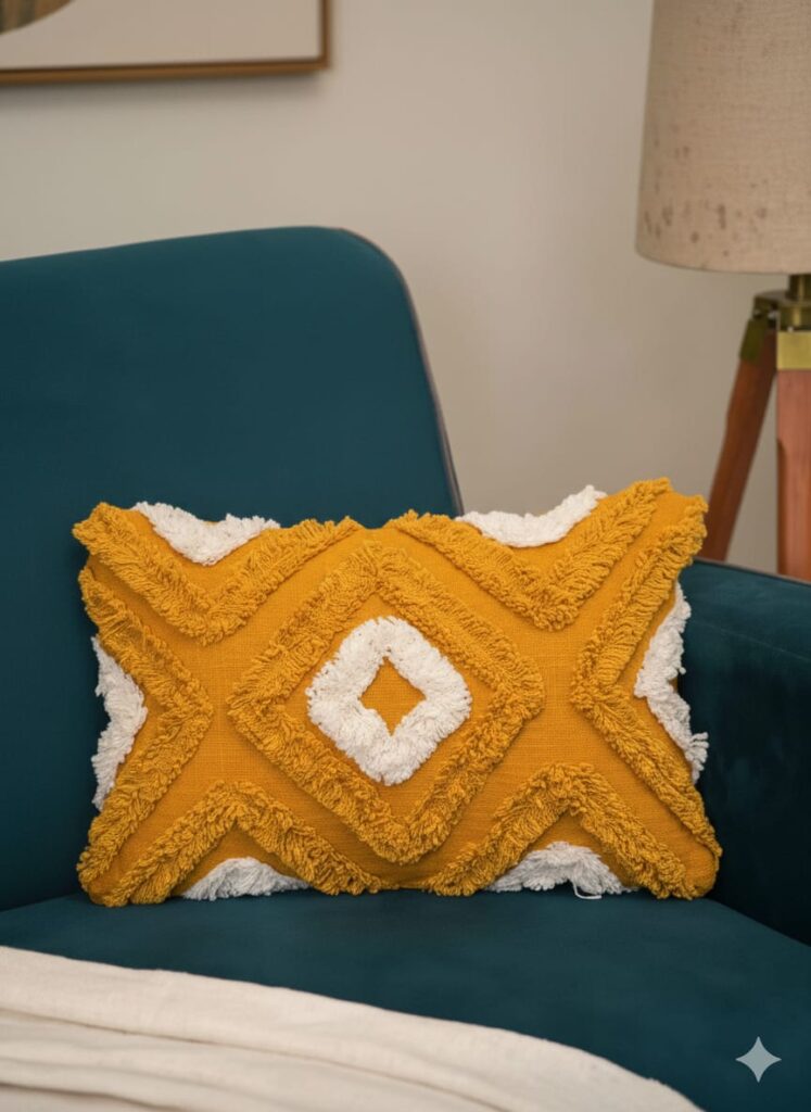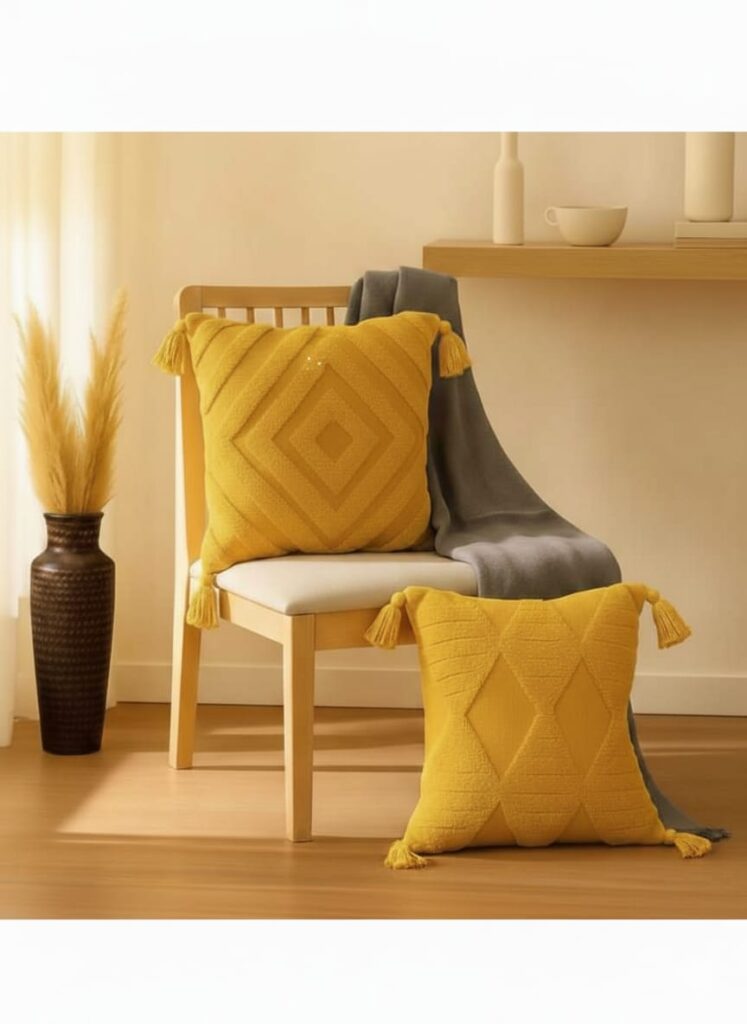 Price: Under ₹700 (68% Off – Check latest price on Amazon) Material: 100% Cotton (Hand-Tufted Texture) Size: 16 x 16 Inches Design Style: Boho | Geometric | Mustard Yellow | Tassel Detail Why We Love It: These hand-tufted cotton cushion covers instantly add texture and warmth to any space. The geometric boho trapeze pattern with fuzzy pom details gives a premium, designer look at a budget price. The mustard yellow shade is perfect for brightening neutral sofas and creating a cozy, Pinterest-worthy living room. Best For: ✔ Living Room Decor ✔ Bedroom Styling ✔ Sofa & Couch Accents ✔ Boho & Modern Interiors