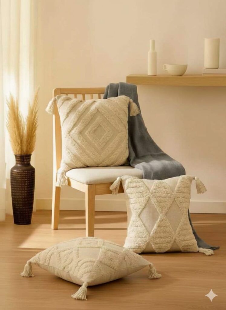 Price: Under ₹500 (50% Off – Check latest price on Amazon) Material: 100% Cotton (Sag-Tufted Texture) Size: 16 x 24 Inches (Rectangle) Design Style: Boho | Geometric | Hand-Tufted | Neutral Tones Why We Love It: This rectangle boho cushion cover adds style and texture to any space. The geometric sag-tufted design gives a designer look at an affordable price, making your sofa, bed, or accent chair instantly cozy and Pinterest-worthy. Its neutral color palette blends seamlessly with modern, minimal, and boho interiors. Best For: ✔ Living Room Decor ✔ Bedroom Styling ✔ Sofa & Couch Accents ✔ Boho, Modern & Minimal Interiors