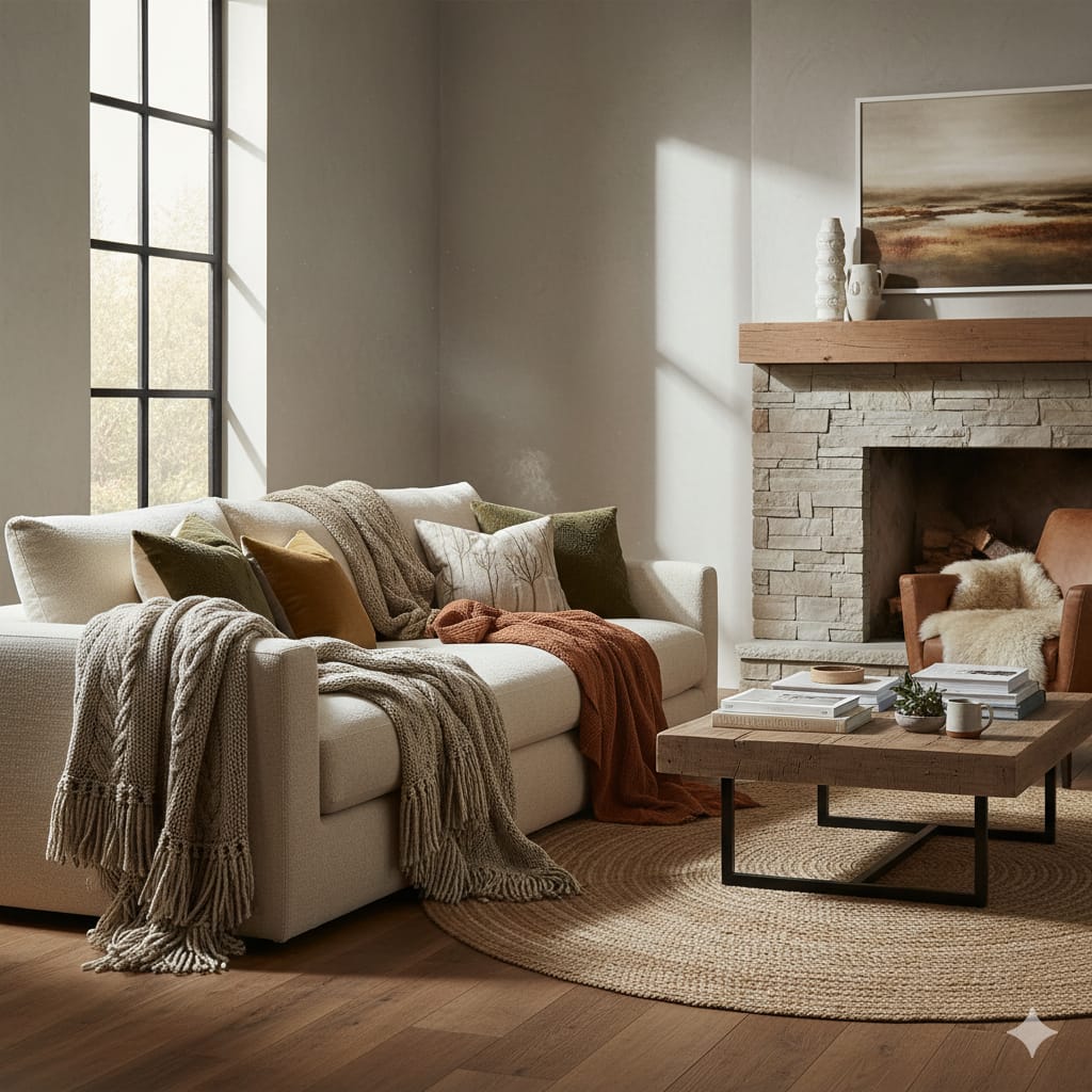 Tip: Stick to warm, neutral tones for a soothing vibe, or add rich colors like mustard, deep green, or burnt orange to create a seasonal cozy feel.